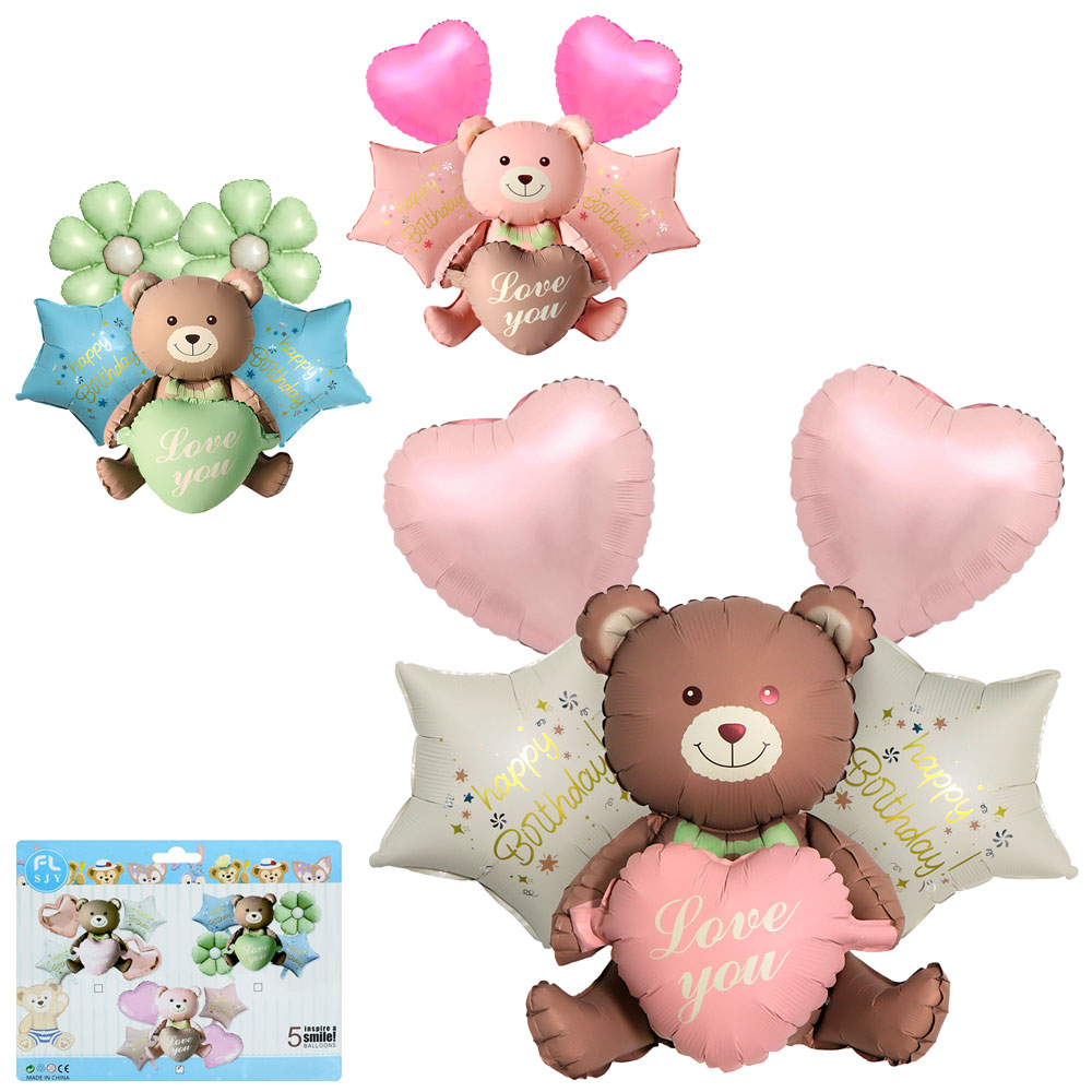 Кульки надувні 5648 набір 5шт (ведмедик 67см Love you, зірка 43см 2шт Happy Birthday, серце 42см 2шт), 3 види, у пакеті, 22-16-0,5см
