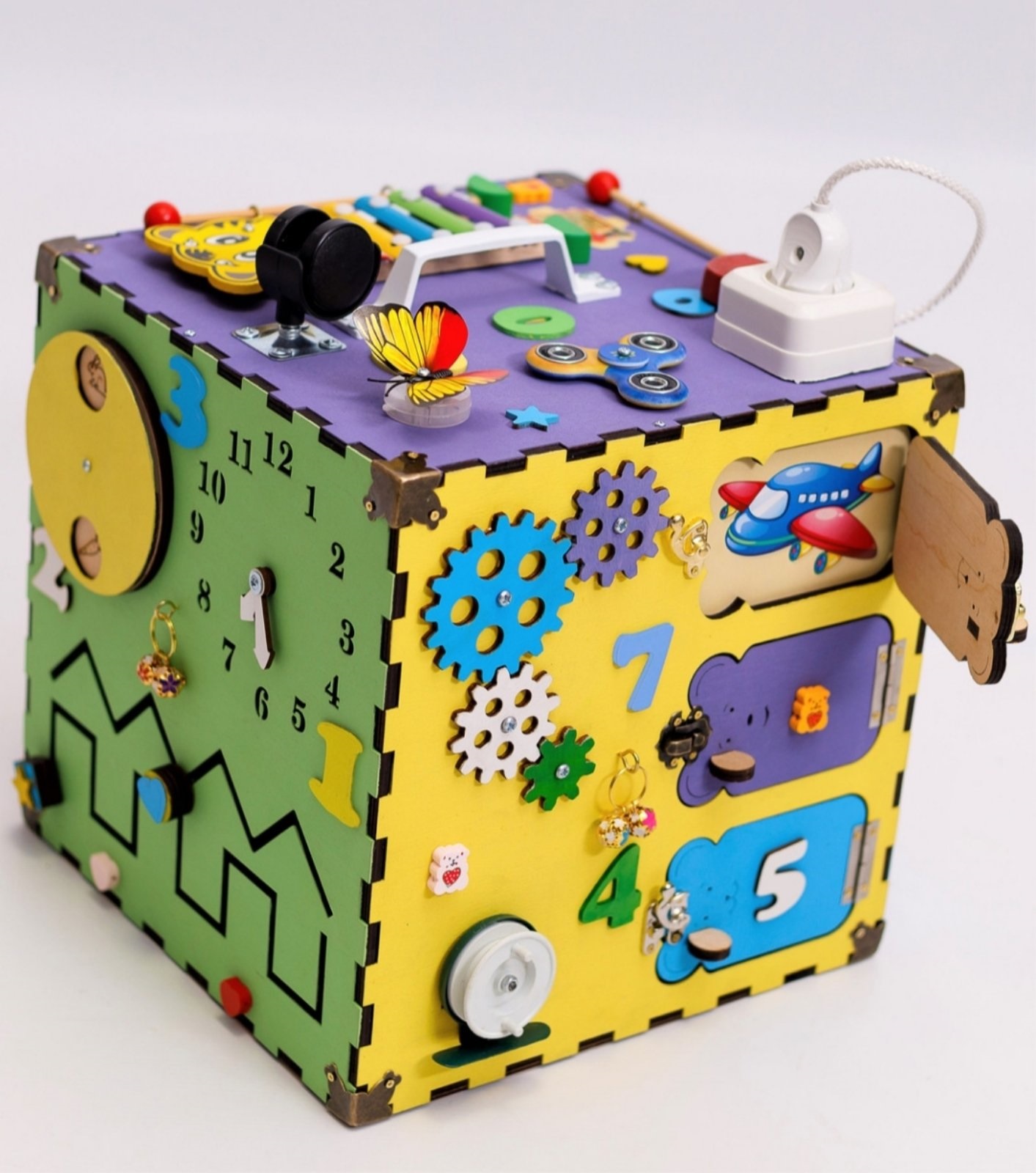 Бізі куб деревяний різнокольоровий 30*30*30см (сірий/рожевий/різнобарвний)