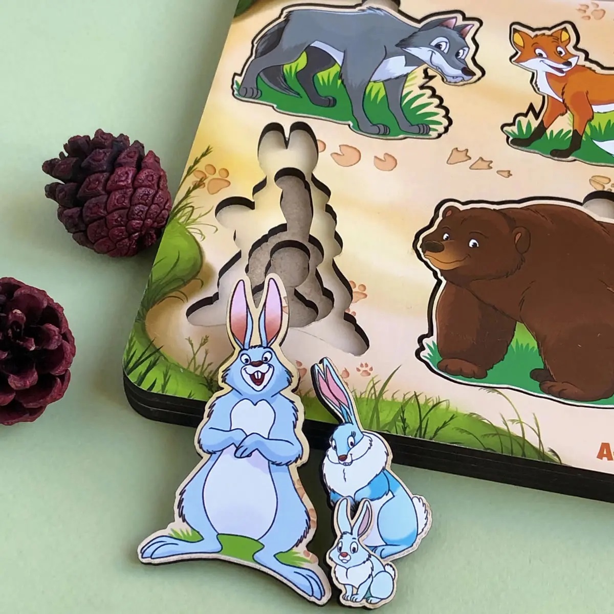 У наборі 4 сім’ї: тато, мама і малюк. Фігурки одного виду вкладаються в одне поглиблення: спочатку дитинча, потім мама і останнім тато. За допомогою такої гри можна пояснити елементарні математичні поняття: рахунок (порядковий, зворотний), кількість, величину “великий-середній-маленький”, а також навчити групувати фігурки одного виду.
