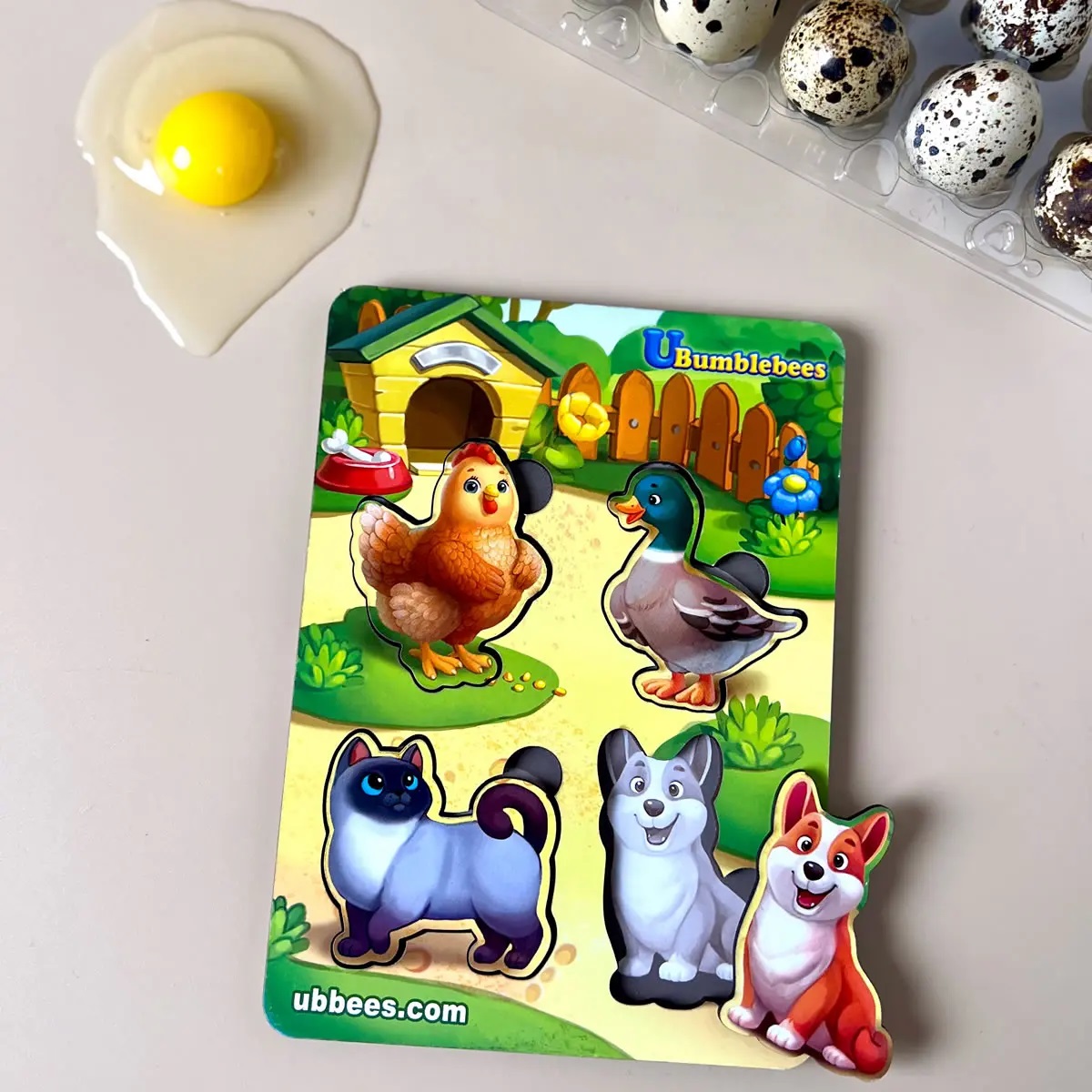 вкладиші з підказкою-силуетом кожної тварини на дні. Рамки-вкладиші розвивають дрібну моторику пальчиків (яка безпосередньо пов’язана з розвитком мови), координацію рухів, сенсорику, тактильні відчуття, допомагають навчити початковому рахунку (від 1 до 4), вмінню порівнювати розміри (маленький-великий, більше-менше).