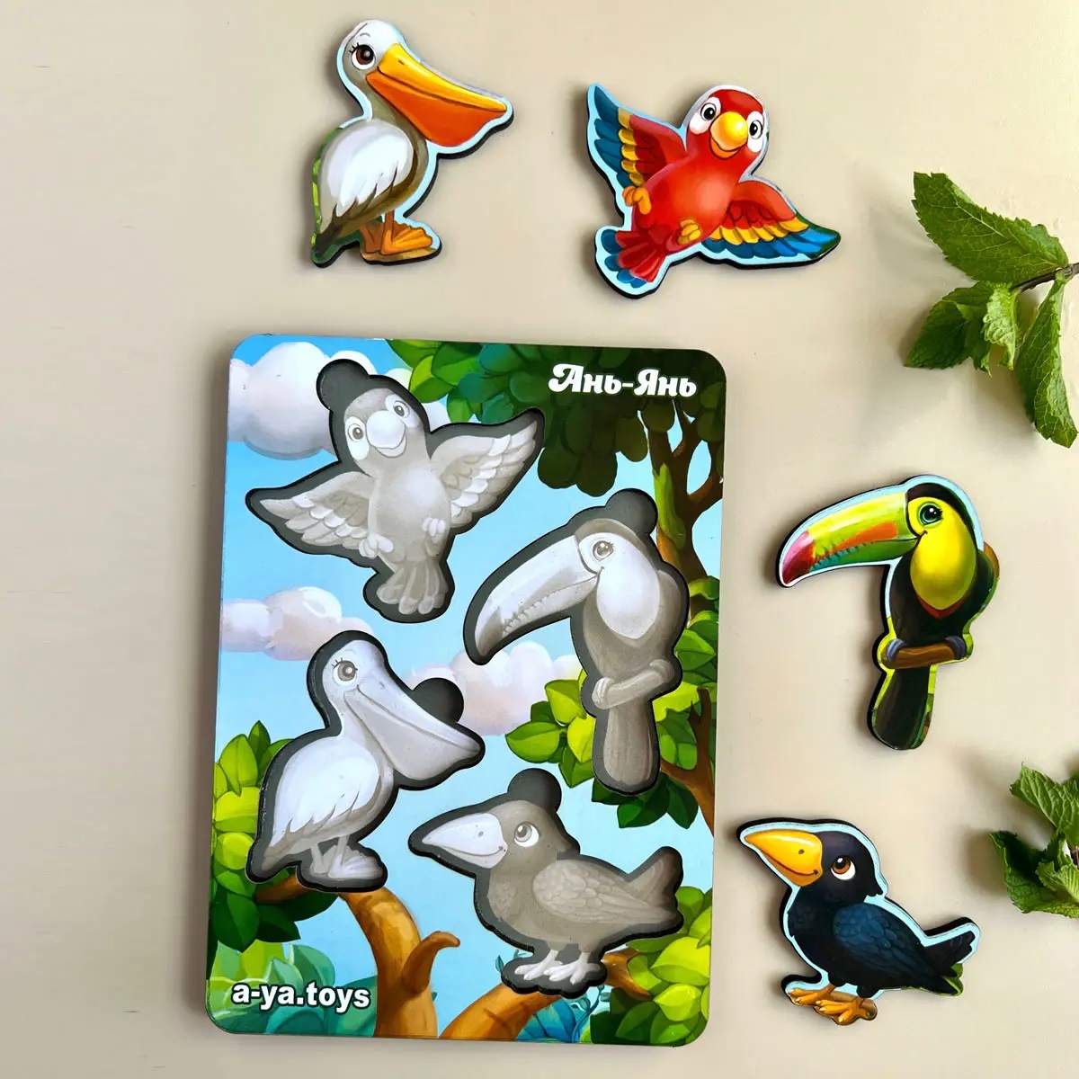 Міні-вкладиші з підказкою-силуетом кожної пташки на дні. Рамки-вкладиші розвивають дрібну моторику пальчиків (яка безпосередньо пов’язана з розвитком мови), координацію рухів, сенсорику, тактильні відчуття, допомагають навчити початковому рахунку (від 1 до 4), вмінню порівнювати розміри (маленький-великий, більше-менше).