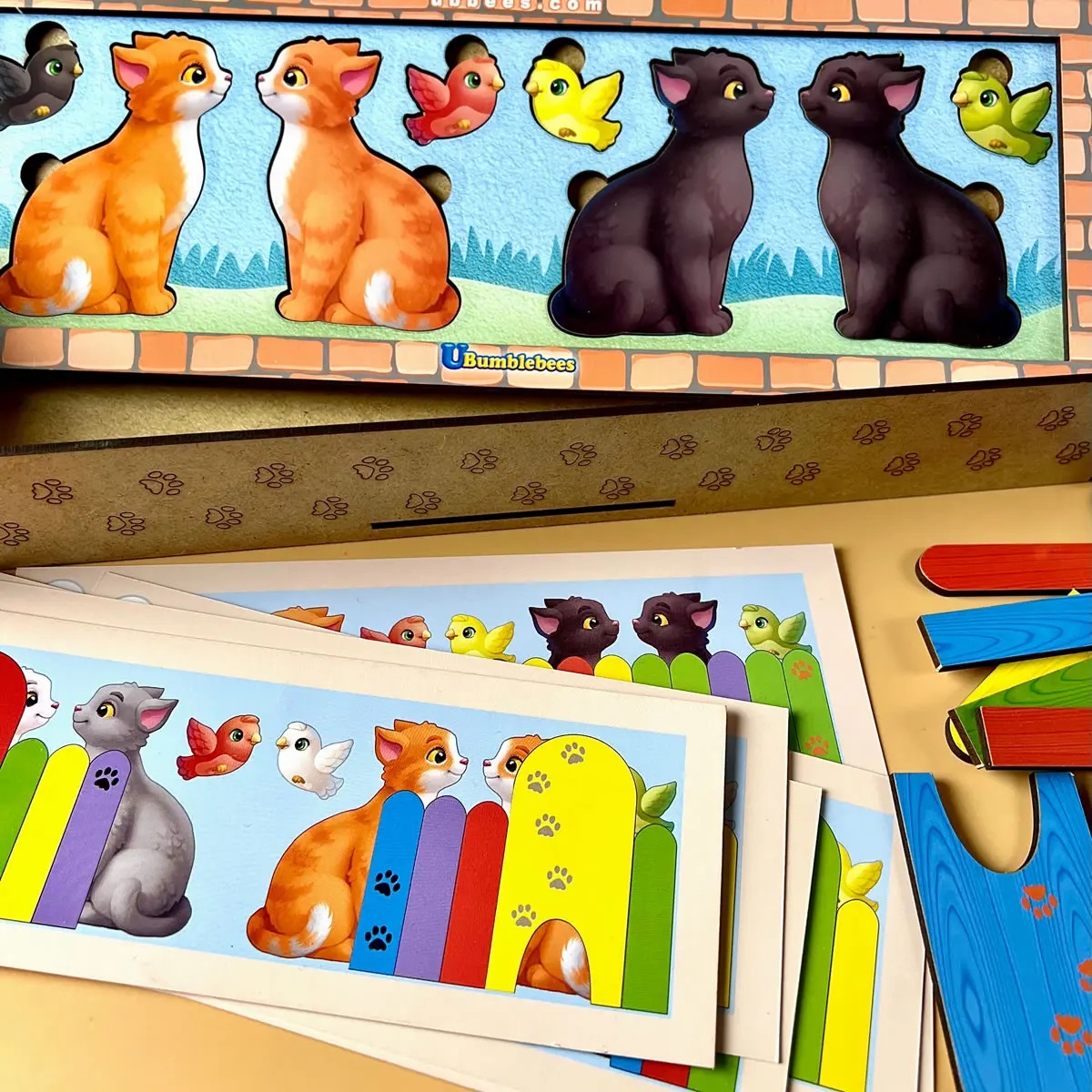 Розміри: 16 х 23 х 5 см. У наборі: 8 котиків, 6 пташок та 35 дощечок.
