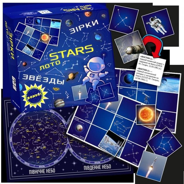 Чудовий подарунок для допитливих! Розвиваюча навчальна гра для будь-якого віку! Познайомить з чарівним світом КОСМОСА! Сузір’я, зірки, планети, осягнення землянами Всесвіту і багато іншого! БОНУС! КАРТА зоряного неба!