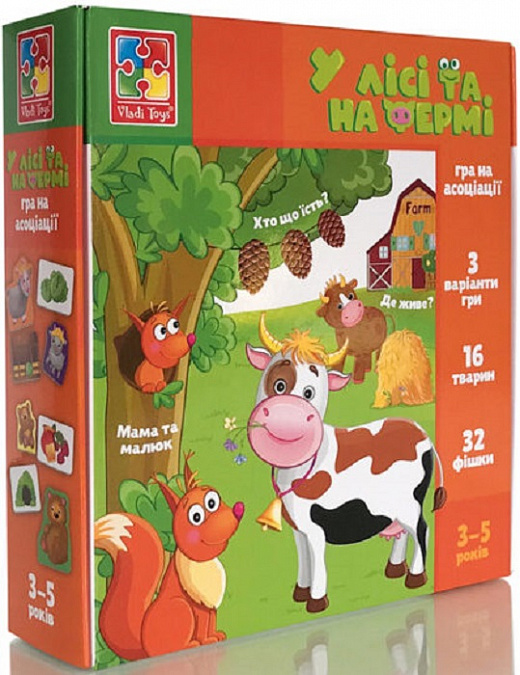 Настільна гра на асоціації “У лісі та на фермі” в наочній ігровій формі допоможе вивчити різні види диких і сільськогосподарських тварин. 1. Для початку визначтеся з ігровою тематикою і виберіть один із запропонованих варіантів гри. 2. Розставте всі ігрові картки перед дитиною і нехай малюк уважно вивчить кожне зображення. 3. Завершальним кроком стане, правильне об’єднання карток між собою. Дана гра неодмінно розвине творчі здібності дитини, уяву, логічне мислення і дрібну моторику ручок.