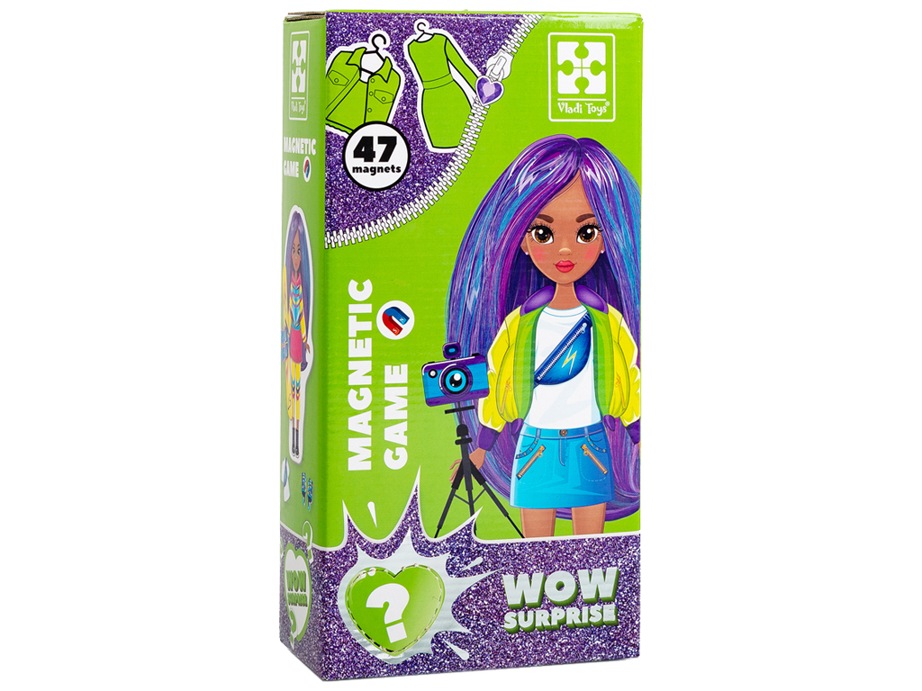 Знайомтеся з нашою героїнею! Вона відома мандрівниця. Окрім подорожей вона обожнює створювати цікаві образи. Підбирайте для дівчинки магнітний одяг та кріпіть до ляльки-основи.