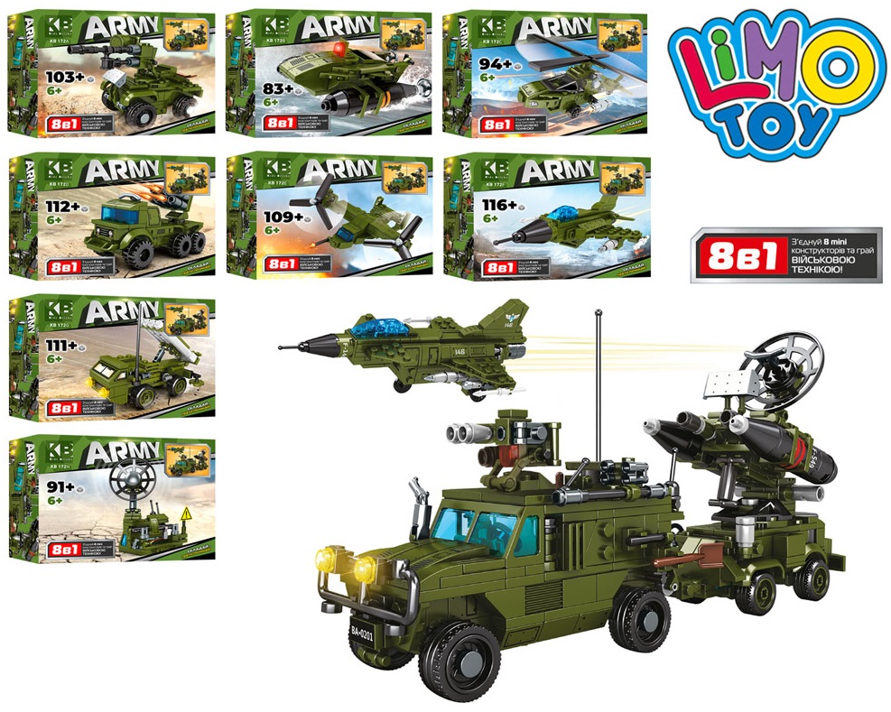 Конструктор 172 військовий, транспорт, від 83 дет.,8 шт. в диспл.,36,5-14-18 см.