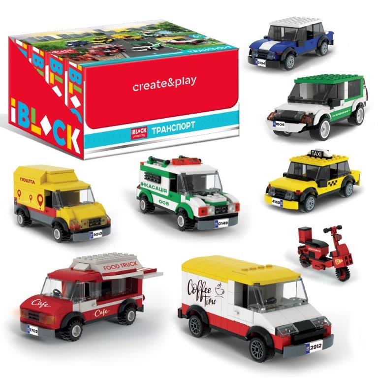 Конструктор 921-436 IBLOCK ТРАНСПОРТ, 8 видів у дісплей боксі, 78-133дет,наліпки, р-р бокса 45*25*17
