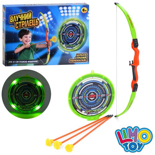 Лук 1562 56см, стріли-присоски 3шт, мішень 23,5см, світло, бат, в кор, 37*25,5*5см