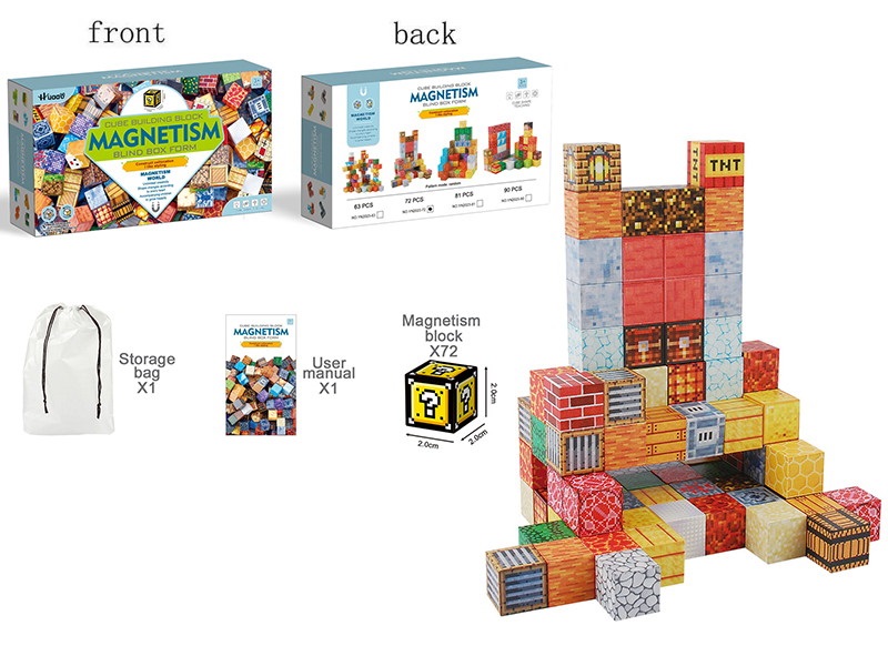 Розвиваючий набір з 72 кубиків у стилі blind-box (сюрприз у кожному блоці). Кубики з’єднуються між собою за допомогою магнітів, що дозволяє створювати цікаві конструкції, форми, башти й навіть будівлі в стилі Minecraft. У комплекті: 108 магнітні блоки (розмір 2×2×2 см), мішечок для зберігання, інструкція.