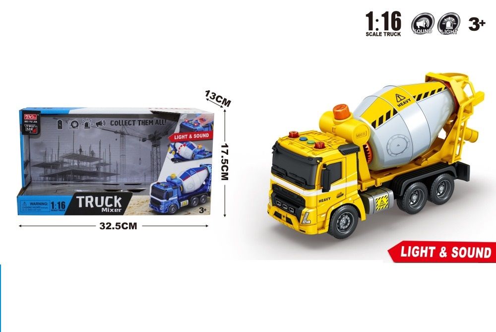 Машинка з серії спецтехніки виконана у вигляді Бетоновозу. Масштаб – 1:16. Рухомі елементи бетонозмішувача. Інерційний механізм руху. Світлові і звукові ефекти запускаються кнопками на даху іграшки.