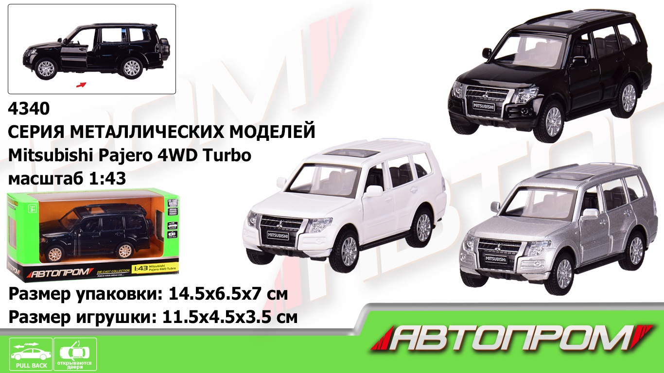 Маш 4340 метал "АВТОПРОМ", 1: 43 Mitsubishi Pajero 4WD Tubro, 3 кольори, відкр.двері, у кор. 14,5 * кількість