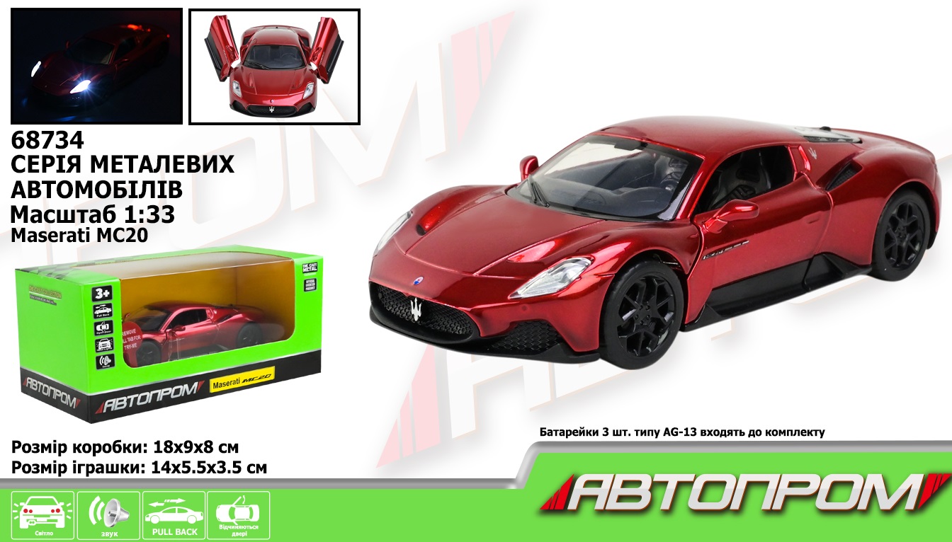 Маш 68734 мет. АВТОПРОМ 1:33 "Maserati MC20", батар, світ., звук, відкр.двері, короб.18*9*8 см кількість