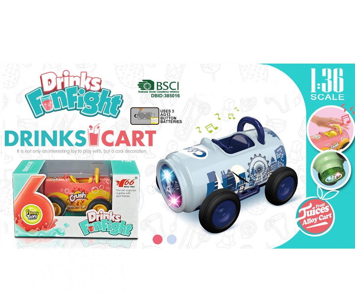 Металева інерційна машинка-банку буде гарним подарунком для дитини. Машина зроблена у вигляді пляшки газованого напою. У машинки світиться кабіна, грає приємна мелодія. У наборі є фігурка продукту.