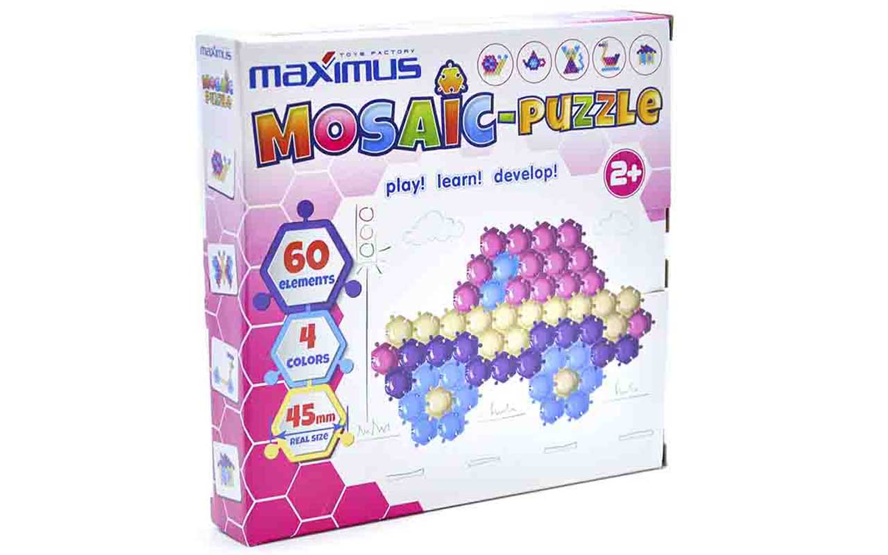 60 елементів. Яскраві та насичені кольори. Розмір деталі 45мм. Зручна упаковка для зберігання. Деталі кріпляться між собою як пазли.