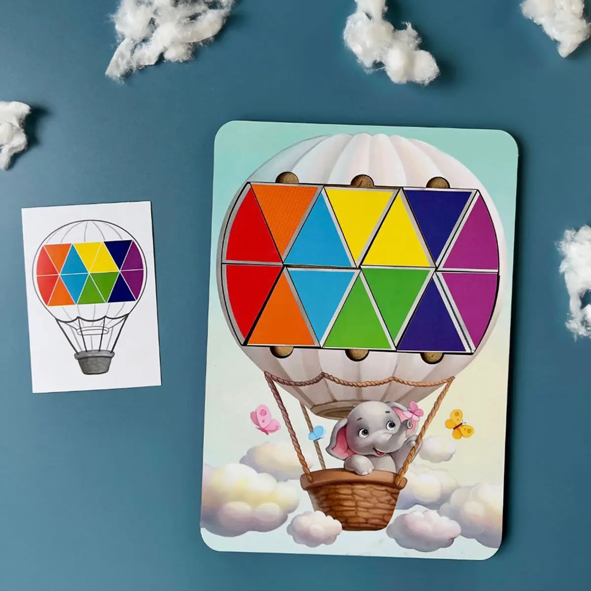 Малюкові необхідно вставити різнокольорові фігури за подобою. Також з трикутників можна викладати різноманітні візерунки, фігури абстракції. Ця гра – відмінний помічник у вивченні рахунку та кольорів. Поки візерунок не зібраний, слоненятко не може злетіти. Запропонуйте дитині придумати для слоника ім’я і тоді грати стане ще цікавіше.