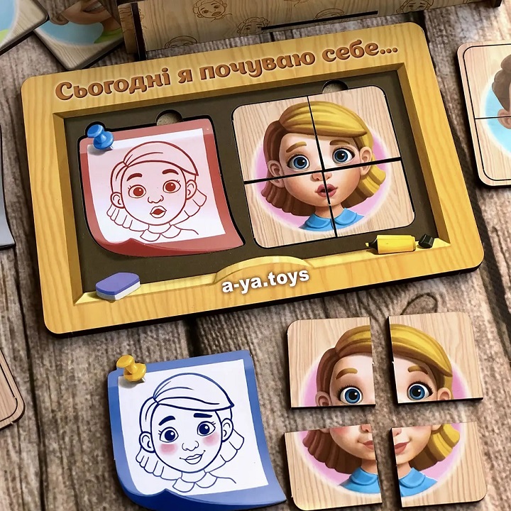 У наборі: 36 деталей для складання 9 пазлів з кольоровим зображенням різних емоцій людини (радість, смуток, здивування і т.д.) та 9 плашок з графічним зображенням емоцій.