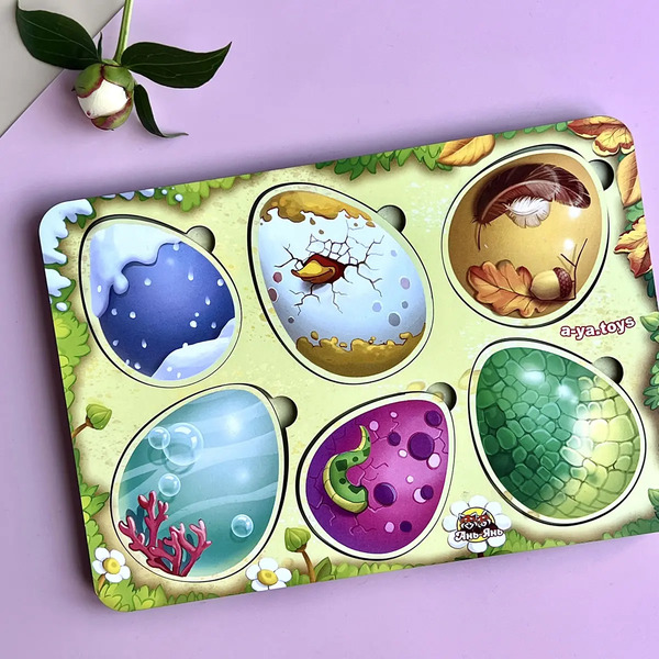 Двошарова гра складається з верхнього шару: 6 яєць, дизайн кожного яйця оформлений з підказкою для дитини (хвостик змії або пір’їнка пташки). Нижній шар складається з 6 вкладишів – дитинчат різних тварин і пташок. Потрібно знайти своє яєчко для кожного.