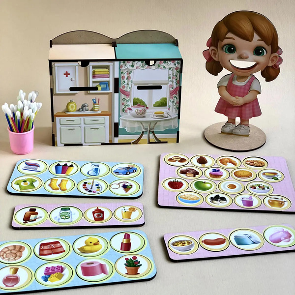 плашка: 4 х 4 см. У наборі: 40 плашок та скарбнички у вигляді холодильника, ванної кімнати, шафи з іграшками, кухонної шафи, обіднього столу та шафи для речей. Завдання дитини розсортувати предмети за потрібними скарбничками: шкарпетки в шафу для речей, ковбасу в холодильник, іграшкову машинку в шафу для іграшок, готову страву на стіл, зубну пасту у ванну кімнату. Дівчинку на підставці звуть Яся. Наведіть порядок та нагодуйте Ясю смачною їжею 🙂