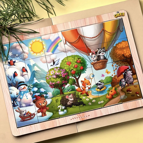 В наборі йде зйомна підказка-фон. Дитині потрібно зрозуміти фрагмент якої картинки на підказці і знайти його . Потім фон -підказку можно дістати і ускладнити завдання