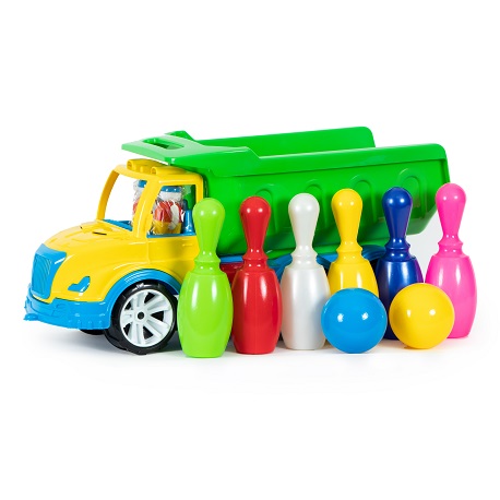 Великий та неймовірно крутий, яскравий та стильний самоскид стане окрасою будь-якої колекції іграшкового транспорту. У автомобіля великий відкидний кузов, в якому зручно перевозити будь-який вантаж. Машинка укомплектована кеглями – 6 шт та 2 кульки.