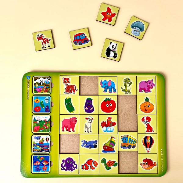 Сортер складається з планшета, на якому зображено 5 тематичних картинок і 25 плашок з різними персонажами і предметами, які дитині необхідно підібрати під олівці за кольором. Гра добре тренує асоціативне мислення у дітей. Плашки також можна рахувати та грати ними у “Меморі” і “5-й зайвий”.