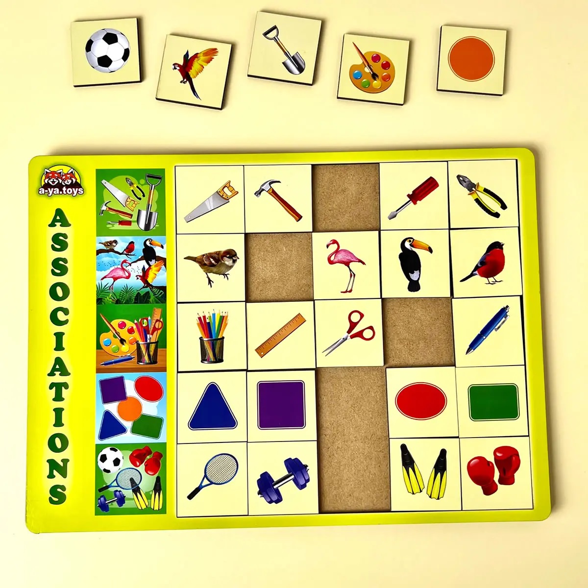 Сортер складається з планшета, на якому зображено 5 тематичних картинок і 25 плашок з різними персонажами і предметами, які дитині потрібно підібрати під тематичні картинки. Гра добре тренує асоціативне мислення у дітей. Плашки можна рахувати та грати ними у “5-й зайвий”.
