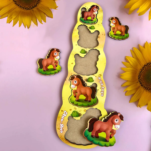 У наборі 5 коників різного розміру. З цим вкладишем можна пояснити дитині, що таке розмір та поняття “великий, середній і маленький”. Вивчаємо рахунок від 1 до 5: запропонуйте дитині порахувати разом скільки всього персонажів? Викладіть кілька коників і попросіть порахувати їх, придумайте їм кумедні імена. Вчимося орієнтуватися у просторі: які коники йдуть праворуч, а які ліворуч?