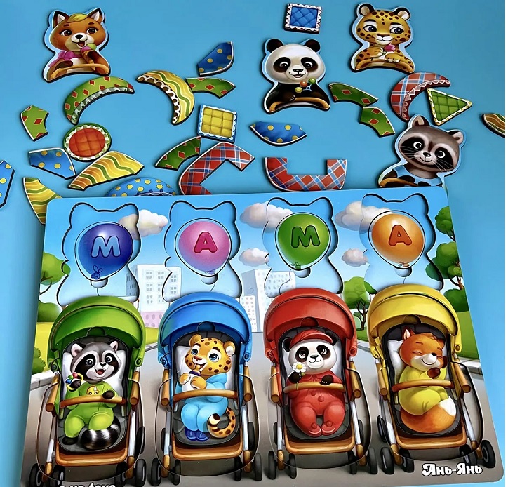 Двошарова гра сортер-вкладиш-пазл “Звірі в колясках” допоможе Вашій дитині освоїти такі поняття як: колір, форма, рахунок, розмір, послідовність, мама і малятко. А ще тренує дрібну моторику рук, пам’ять, увагу, орієнтир у просторі та логічне мислення. Гра буде цікава дітям вже з 1,5 – 2 роки. У цьому віці дитина зможе відкрити (зняти) усі ковдри з діток, яким стало жарко (гру даємо дитині у зібраному вигляді). Не забуваємо озвучувати правильні назви тварин та їх малюків: “мама Лисиця і лисеня”, “мама Панда і дитинча панди”, “мама Ягуар і кошеня ягуара”, “мама Єнот і дитинча єнота”.
