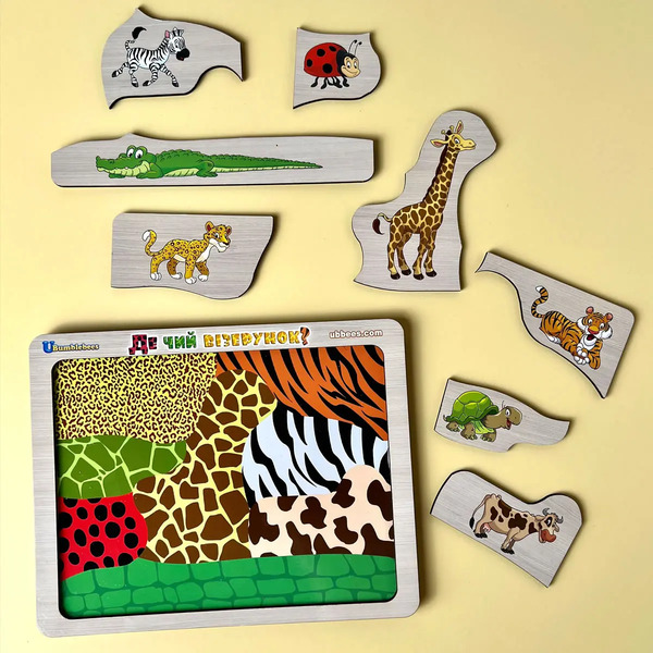 Цікавий сортер-пазл, який допоможе дитині легко вивчити та відрізняти 8 різних тварин. Гра на уважність. Верхній шар – це пазл з тваринами (8 різних деталей), а на нижньому – колаж з візерунків (забарвлень) цих тварин. Потрібно підібрати “Де ж чий візерунок?”. Важливо проговорювати: Чим відрізняються тварини? Вони дикі або домашні? Хижак чи ні? Розвивайтеся, весело граючи!