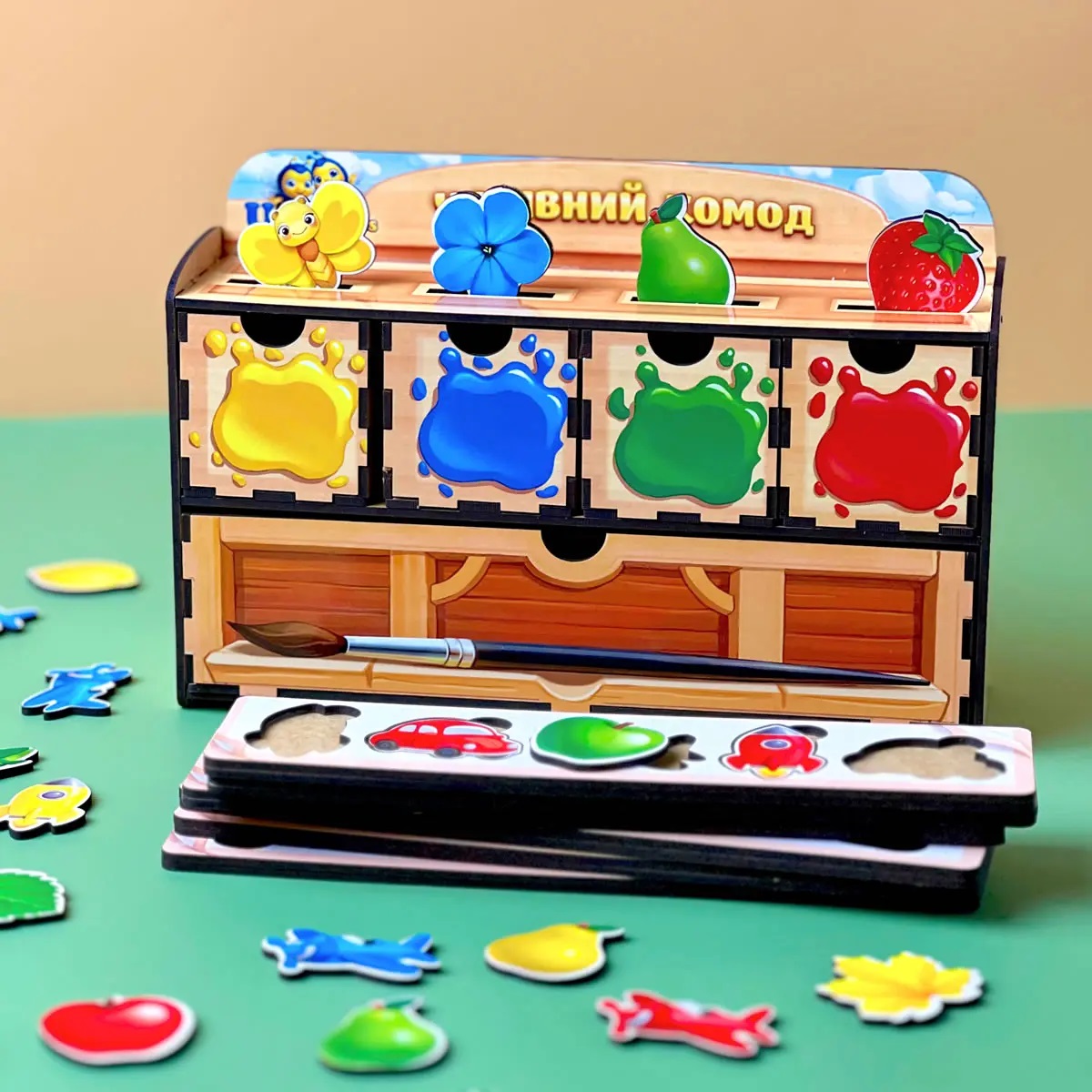 Гра складається з 4 шухлядок для сортування вкладишів за кольором, малюнком та 1 шухляди, де знаходяться планки для вкладання.