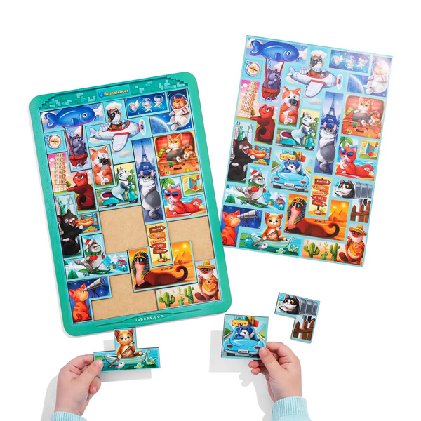 Потрібно розкласти тематичні фігурки так, щоб усі розташувалися на планшеті за прикладом (у наборі йде картинка-підказка) і можна буде побачити, де подорожують ці милі котики. Вивчайте країни світу та рахуйте котиків. Запропонуйте дитині придумати для усіх героїв цікаві імена