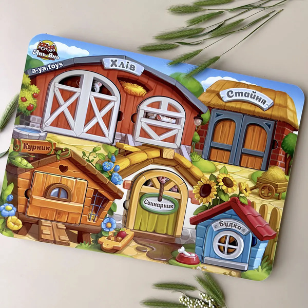 Вкладиш “Ферма” – це 6 родин різних тварин, які живуть на фермі. Необхідно знайти кожній родині її тематичний будиночок-вкладиш. Усі будиночки з індивідуальним дизайном як зовні, так і всередині – це як підказка для дитини, щоб знайти будиночки для усіх тварин. Вивчайте поняття “великий і маленький”, рахуйте тварин. Усі вкладиші зручно діставати пальчиками.